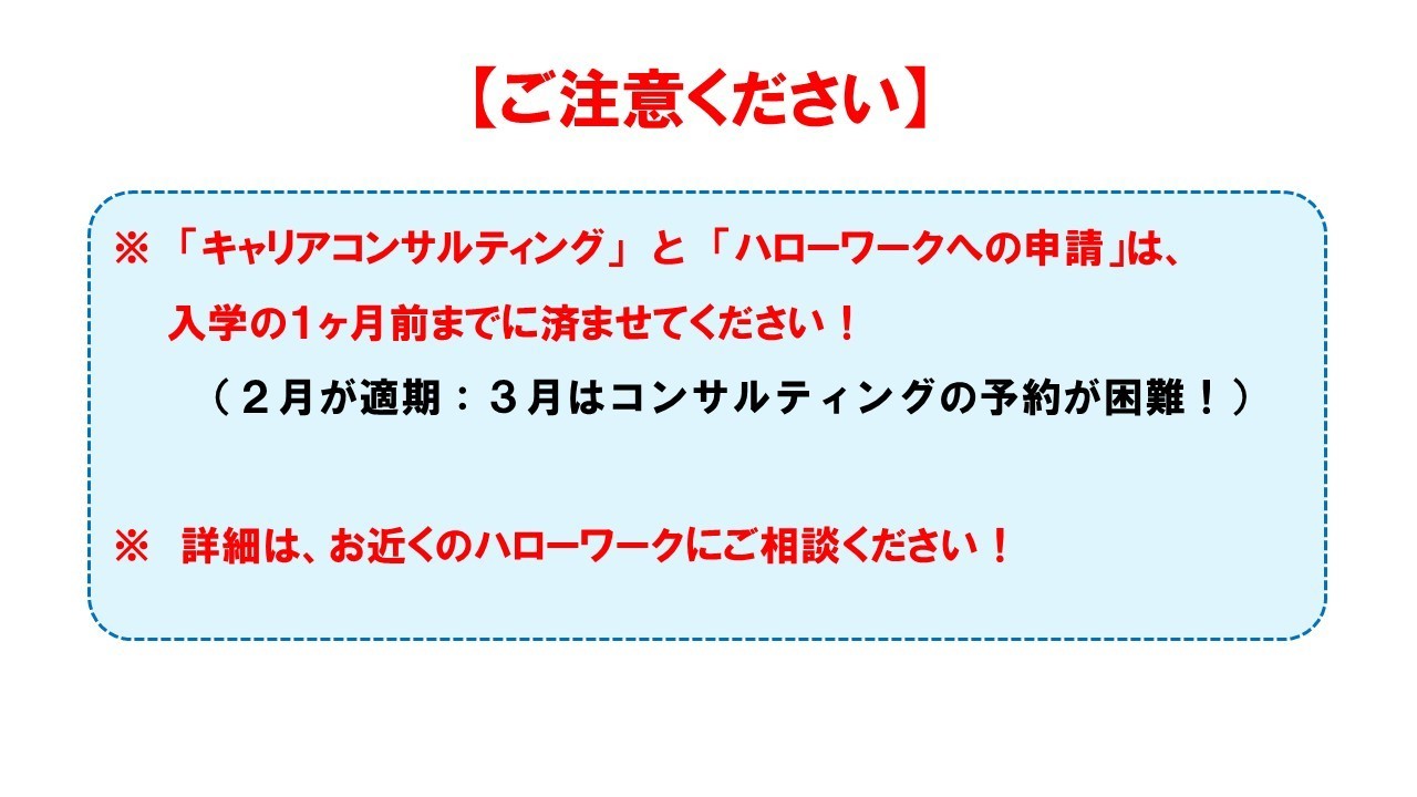 本校は、教育訓練給付制度の指定講座を運営する教育訓練施設です。この制度は雇用保険法第60の2に基づくもので、転職を考えている方を対象に講座の修了者には在学中と卒業後に給付されるものです。